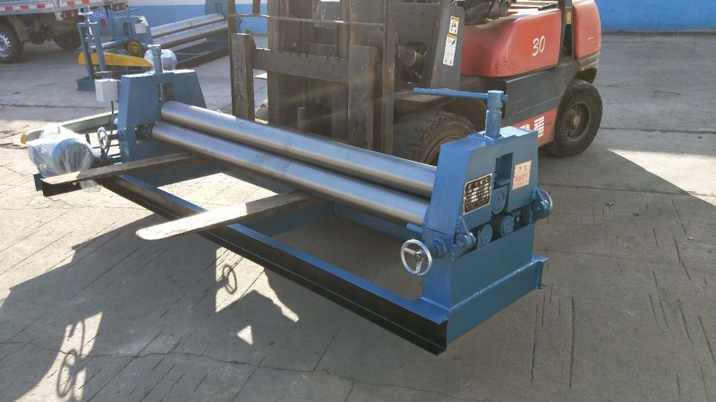 半自動卷板機(jī)結(jié)構(gòu)形式為三輥對稱式。上輥在兩下輥中間對稱位置作垂直升降運(yùn)動,通過絲杠實(shí)現(xiàn)上輥的升降,便使所卷制的材料變形,該卷板機(jī)是用于金屬板材型材彎曲、變型的一種通用設(shè)備,它借助于專用工具或其它設(shè)備來完成板材端面的預(yù)彎,可以卷制圓形、弧形工件,在石油、化工、鍋爐、水電、造船、工業(yè)設(shè)備安裝以及機(jī)械制造行業(yè)中有著廣泛的應(yīng)用。該機(jī)器采用倒順開關(guān)(已安裝在卷板機(jī)上)來實(shí)現(xiàn)卷板的正、反轉(zhuǎn),檢查機(jī)器無誤后,調(diào)節(jié)絲杠讓上輥壓至板材表面,把倒順開關(guān)打到“倒”“順”視現(xiàn)場板材的放入端而定讓電動機(jī)正轉(zhuǎn)還是把反轉(zhuǎn),卷制一邊后,手動調(diào)節(jié)絲杠讓上輥壓緊板材在“倒”“順”卷制,如此循環(huán)直至達(dá)至要求為止。