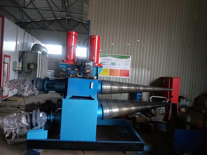 錐形卷板機(jī)卷板進(jìn)程與進(jìn)程一般都選用強(qiáng)制送料的辦法,靠錐形小口與卷板機(jī)前端強(qiáng)制限位擋塊磨擦,迫使錐形大小口成型發(fā)生速度差,到達(dá)卷板機(jī)上輥的素線一直與錐形坯料的素線重合,完結(jié)錐形成型,所以錐形小口下料時(shí)有留有錐形小口與卷板機(jī)限位擋塊彼此磨損效果的工藝余量。